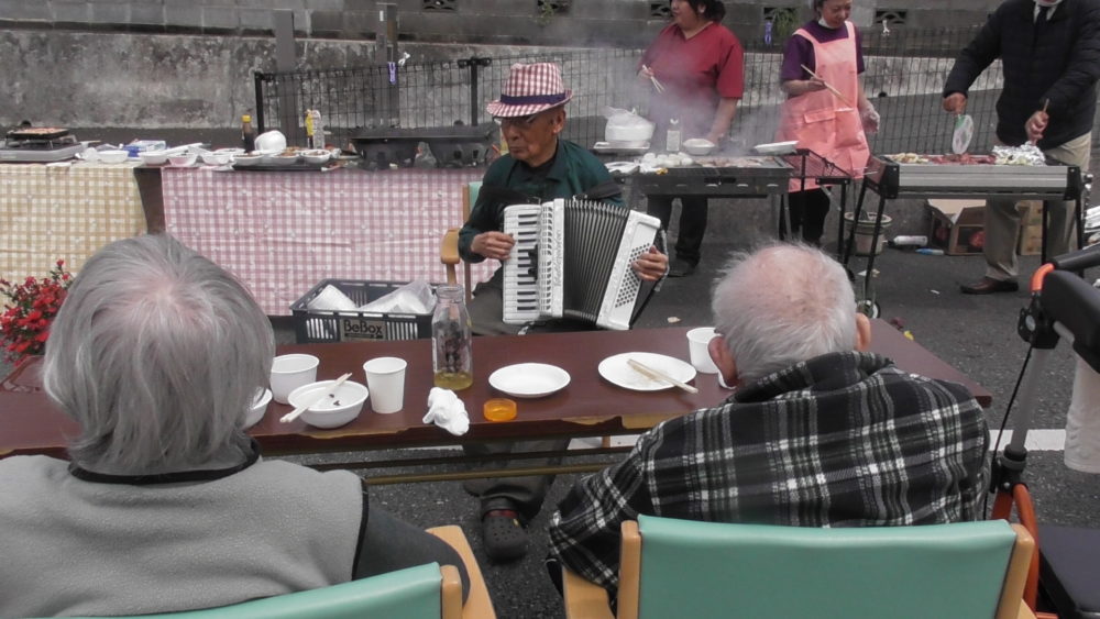 ケアホーム保田窪です。4月3日。コロナにも負けず、今年も?花見を駐車場にて行いました。