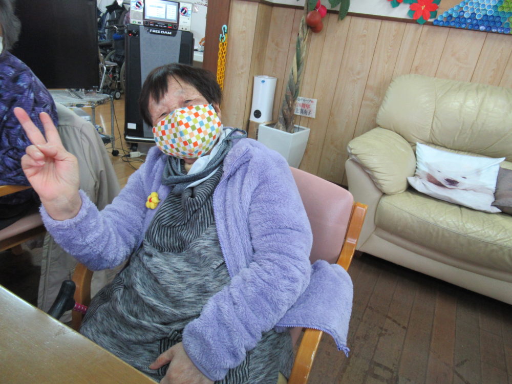 初詣のあとにデイサービスより皆さんにお年賀で手作りマスクをお渡ししました