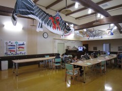 鯉のぼりと入居者様がコツコツと作られた鯉のぼりが40匹以上